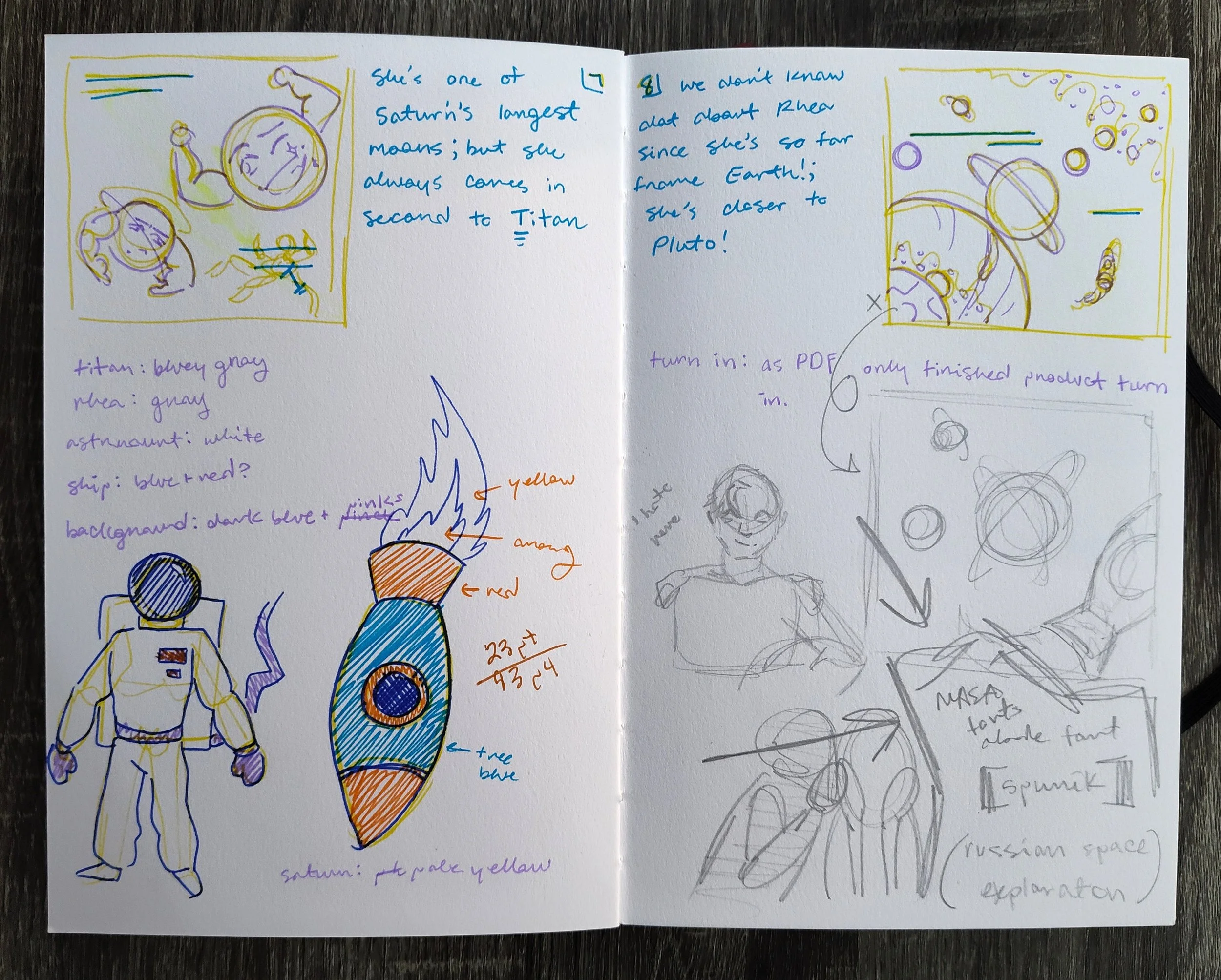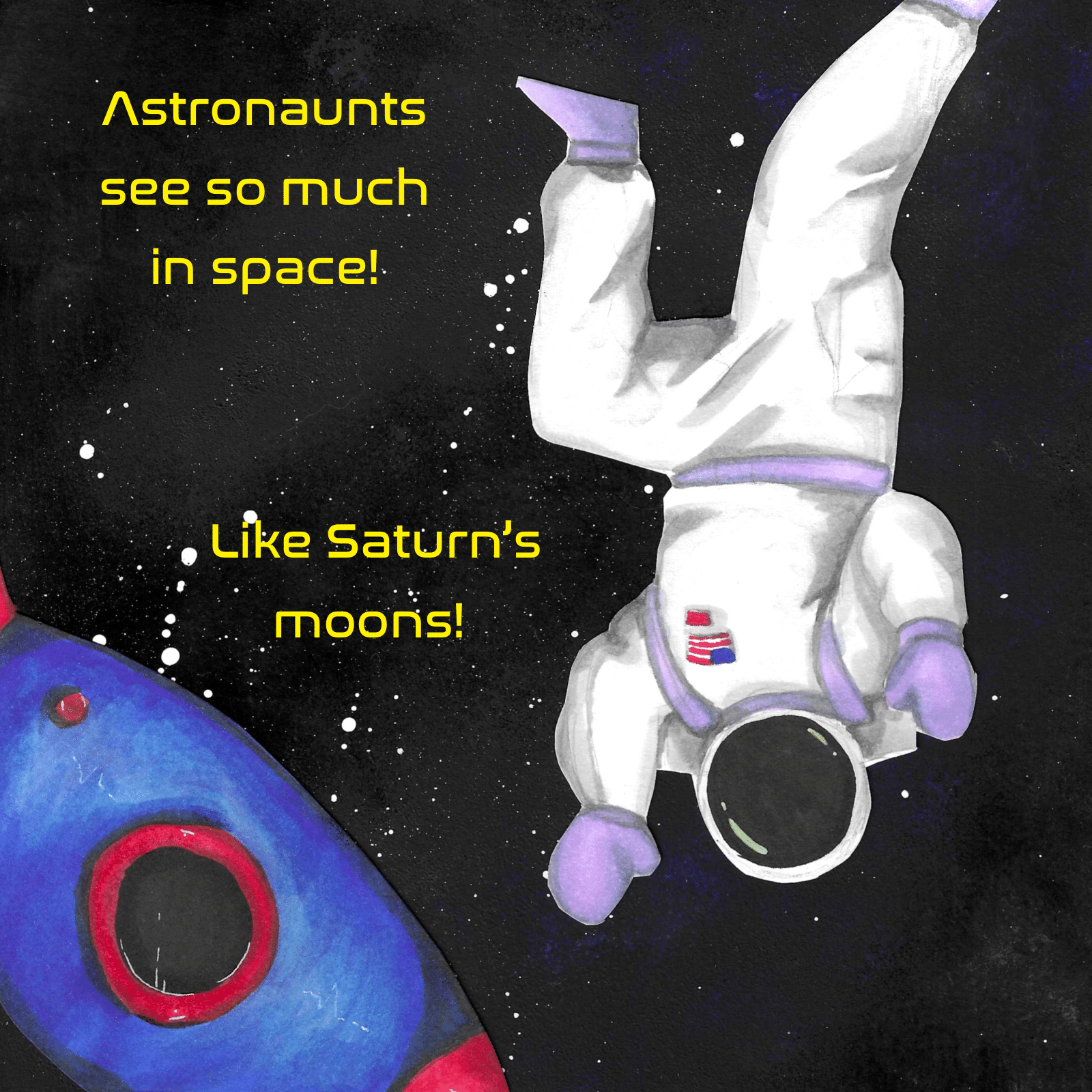 I was given the word “rocket” and immediately new that I had to something space themed for my own pure enjoyment. I knew I wanted dark galaxy backdrops, but I also knew that attempting to color dark galaxies around light colored objects would take a long time so I went with a mixed media approach to met deadlines. I hand cut seven 8x8 pieces of paper and painted galaxy patterns on them with acrylic paints. Then I sketched and colored the astronaut, rocket, and other objects in the story on Bristol paper, colored them with alcohol markers, and then hand cut each object out and pasted them onto my paintings. Once dried, I took photos of the pages and put them into Photoshop tweak a few things and then put the edited images into Adobe Illustrator to add the text.