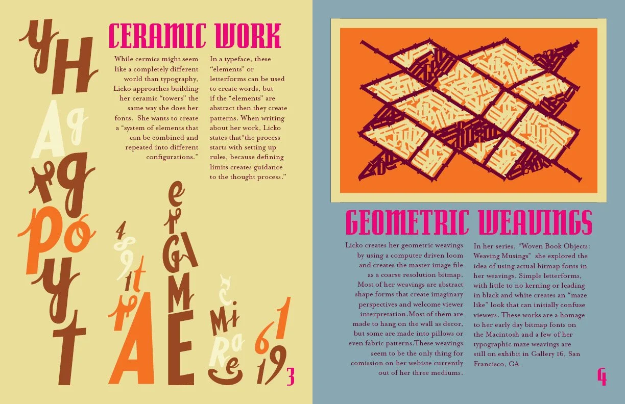 Later in my academic career, I got the opportunity to redo my first attempt at this assignment. I picked a completely different typographer and got to work. Unlike Morison, Licko had different bodies of work that I could research and include in my designing process. I started with colors again, I reviewed her portfolio and picked colors that reoccurred throughout it. For this work, all the fonts used where made by Licko; she has a larger and more available variety of fonts. I knew i wanted a introductory page and three pages themed around different bodies of work: Emgire Magazine, her ceramic tower series, and her geometric weavings. In the early days of Emgire Magazine, most of their covers were collages so I knew I had to make a collage in Photoshop for page two, referencing her towers and history of professionalism. For the ceramic and weavings pages, I created graphic renditions of her works using only letter forms (and some related words) in Adobe Illustrator and put all the components together in Adobe InDesign.